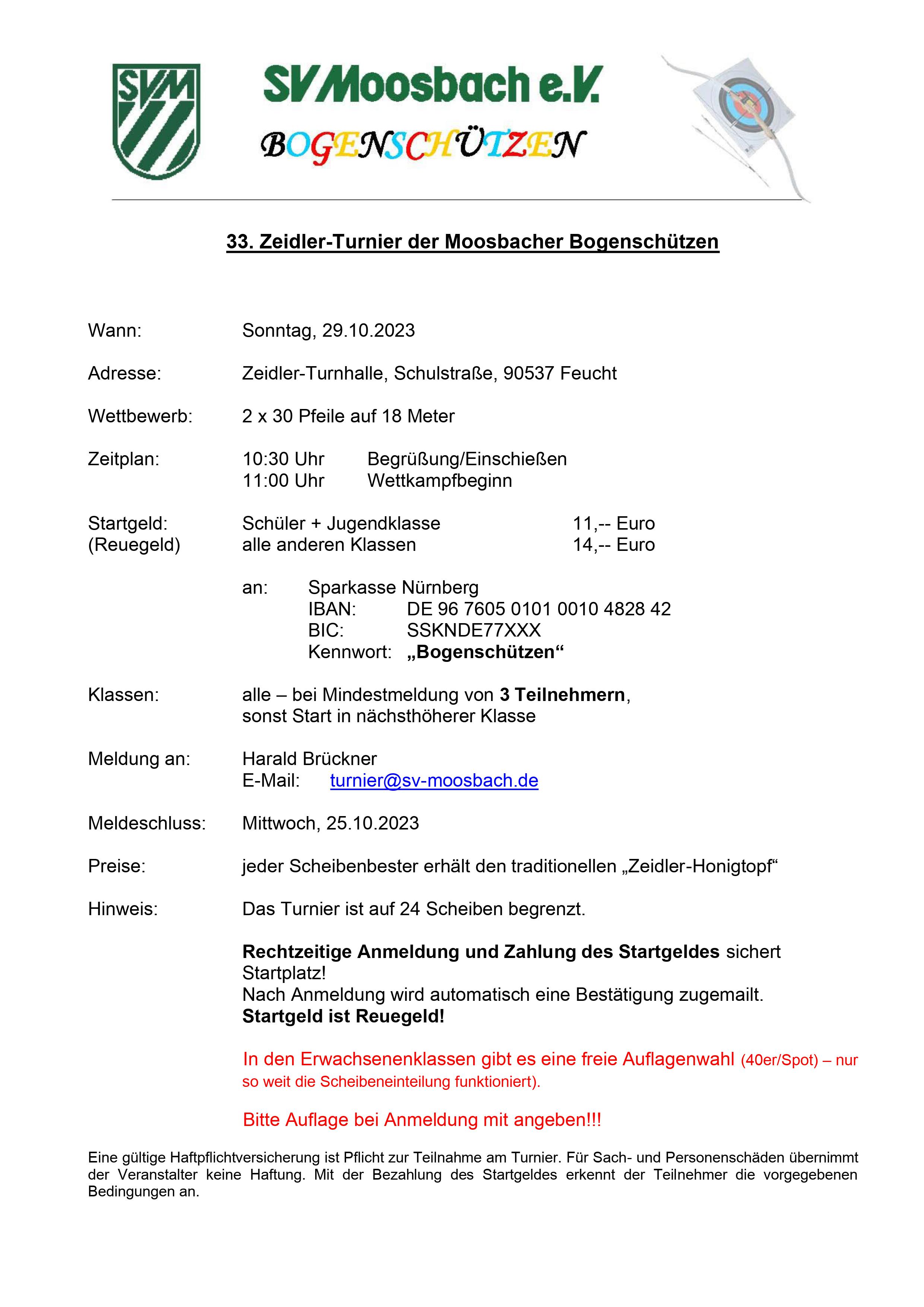 Einladung zum 33. Zeidler-Turnier der Moosbacher Bogenschützen