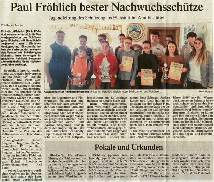 Pfahldorf - Einstimmig haben die Vertreter aus 21 Vereinen des Schützengaus Eichstätt ihren bisherigen Jugendleiter Reinhard Bergmann (Adler Buxheim) für die nächsten zwei Jahre bestätigt. Ebenfalls in ihren Ämtern bestätigt wurden die Stellvertreter Martina Regler (SV Jurahöhe Pfahldorf) und Peter Glaßmann (Schützenclub Tauberfeld). In der Gaujugendleitung wirken auch zwei Gaujugendsprecher mit. Als Sprecher für die weiblichen Jugendlichen musste Katharina Bauernfeind (SV Biburg-Stadelhofen) als neues Mitglied in die Jugendleitung gewählt werden. Für den männlichen Jugendbereich zeigt sich Matthias Biedermann (SV Höbing) wie in den zwei Jahren zuvor, zuständig. Neu hinzu kam zum ersten Mal mit Franz Hacker aus Hofstetten ein Jugendrundenhelfer.