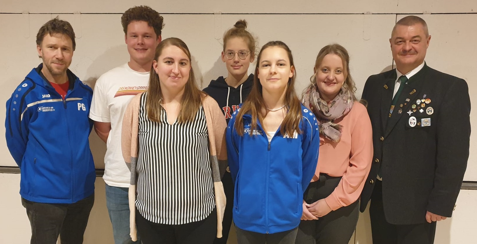 (Foto: Schützengau) neu gewählte Gaujugendleitung - Von links nach rechts, stv. Gaujugendleiter Peter Glaßmann, Gaujugendsprecher Jonas Heiß, stv. Gaujugendleiterin Martina Löchl, Gaujugendsprecherin Rebecca Heiß, Gaujugendsprecherin Amelie Morgott, Gaujugendleiterin Antonia Iberl, stv. Gaujugendleiter Reinhard Bergmann