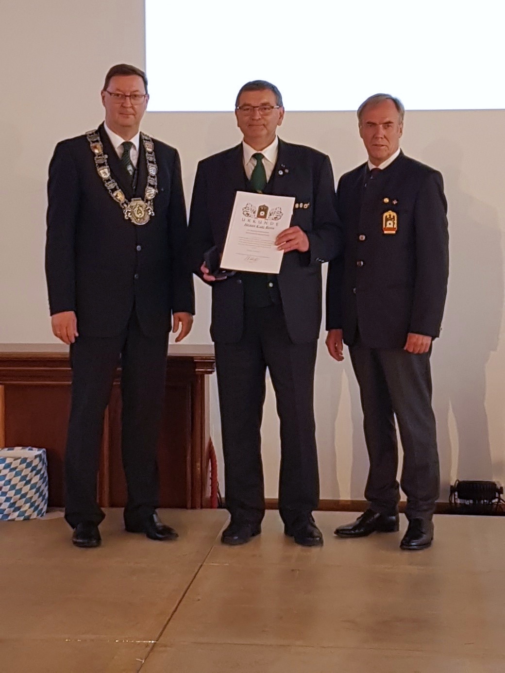 Eichstätt/München - Am 71. Bayerischen Schützentag in München wurde Gauschützenmeister Karl Renn mit der höchsten Auszeichnung der allgemeinen Ehrungen die der Deutsche Schützenbund zu vergeben hat ausgezeichnet. Der Präsident des Deutschen Schützenbund Hans-Heinrich von Schönfels und der 1. Landesschützenmeister des Bayerischen Sportschützenbundes Christian Kühn überreichten ihm das Ehrenkreuz in Gold "Sonderstufe".