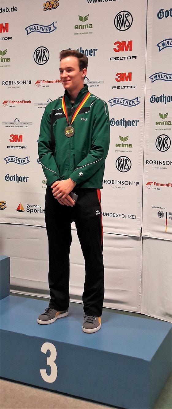 Hochbrück - Paul Fröhlich, von den Hubertusschützen Hitzhofen/Oberzell sicherte sich wie im vergangenem Jahr am Olympischen Wochenende zur Deutschen Meisterschaft in Hochbrück Bronze für den 3. Platz bei den Junioren in der Disziplin Luftpistole Einzeln. Das Vorkampfergebnis von 568 Ringen reichte für den Einzug ins Finale, in dem Paul Nervenstärke bewies und sich bis in die Medaillenränge kämpfte.